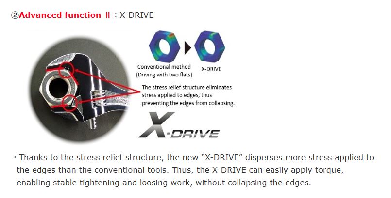 - Nhờ cấu trúc giảm ứng suất, “X-DRIVE” mới phân tán nhiều ứng suất hơn được áp dụng cho các cạnh so với các công cụ thông thường. - Do đó, X-DRIVE có thể dễ dàng áp dụng mô-men xoắn, cho phép siết chặt và nới lỏng ổn định, mà không làm hỏng các góc cạnh của đai ốc, bulong.