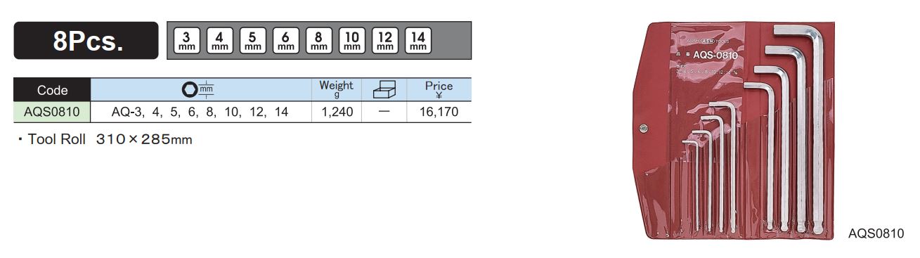 Bộ lục giác AQS0810 là bộ lục giác 3-14mm đầu bi dài. 100% được sản xuất tại Nhật Bản