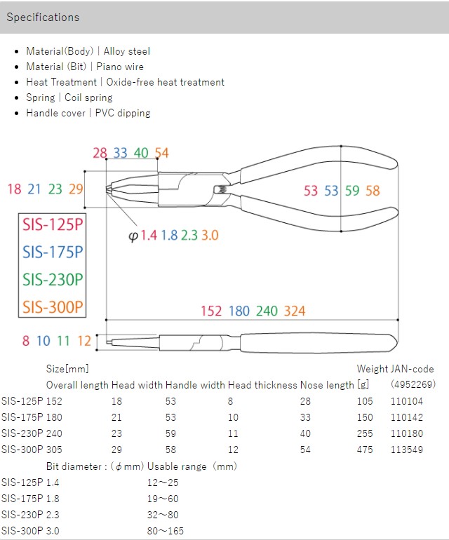 Bảng thông số Kìm bóp phanh mũi thẳng SIS Tsunoda