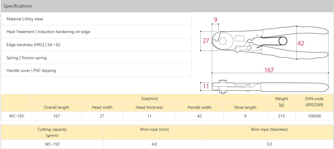 Thông số kỹ thuật Kìm cắt cáp thép WC-150 Tsunoda
