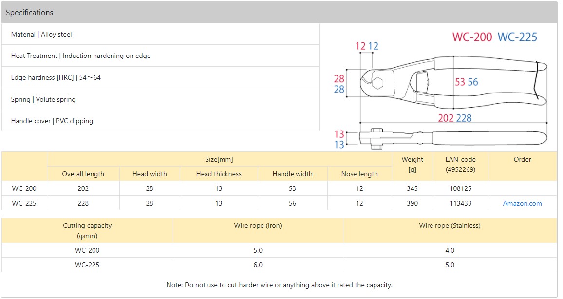 Thông số kỹ thuật Kìm cắt cáp thép WC-200/225 Tsunoda
