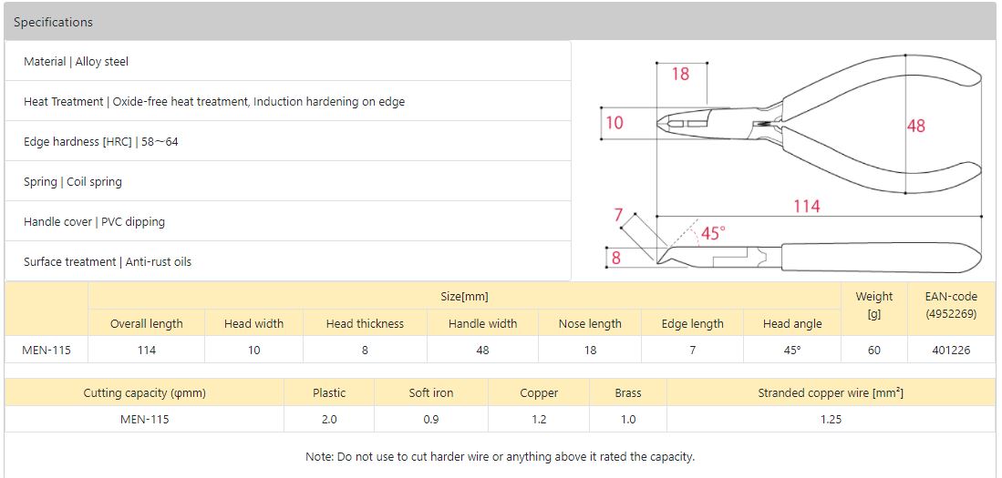 Kìm cắt góc MEN-115 hay còn gọi là kìm cắt cạnh chéo là dòng kìm nhỏ ngọn chuyên cắt chân linh kiện điện tử, cắt cuống nhựa. Thiết kế đầu mũi check 45 độ giúp thao tác dễ dàng, bề mặt cắt phẳng đẹp. Sản phẩm 100% được sản xuất tại Nhật Bản bởi công ty TSUNODA thương hiệu hàng đầu về kìm tại Nhật Bản. Công ty ASAHI đang là nhà phân phối tại Việt Nam