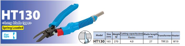 Kìm cắt nhiệt HT-130 được sử dụng để cắt bavia các loại nhựa cứng, nhựa thủy tinh, nhựa kỹ thuật cao.. đỏi hỏi tính chính xác và vết cắt đẹp không bị dạn nứt