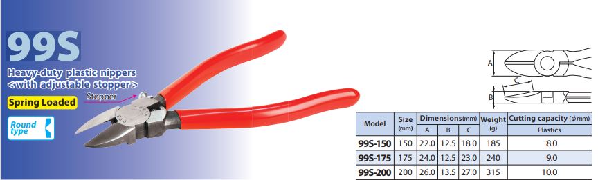 Kìm cắt nhựa 99S-175 Merry do hãng Muromoto sản xuất 100% tại Nhật. Là dòng kìm cắt nhựa tác động mạnh cao cấp. Với tính năng vượt trội cho độ bền cao. Công ty ASAHI đang phân phối sản phẩm trên tại Việt Nam