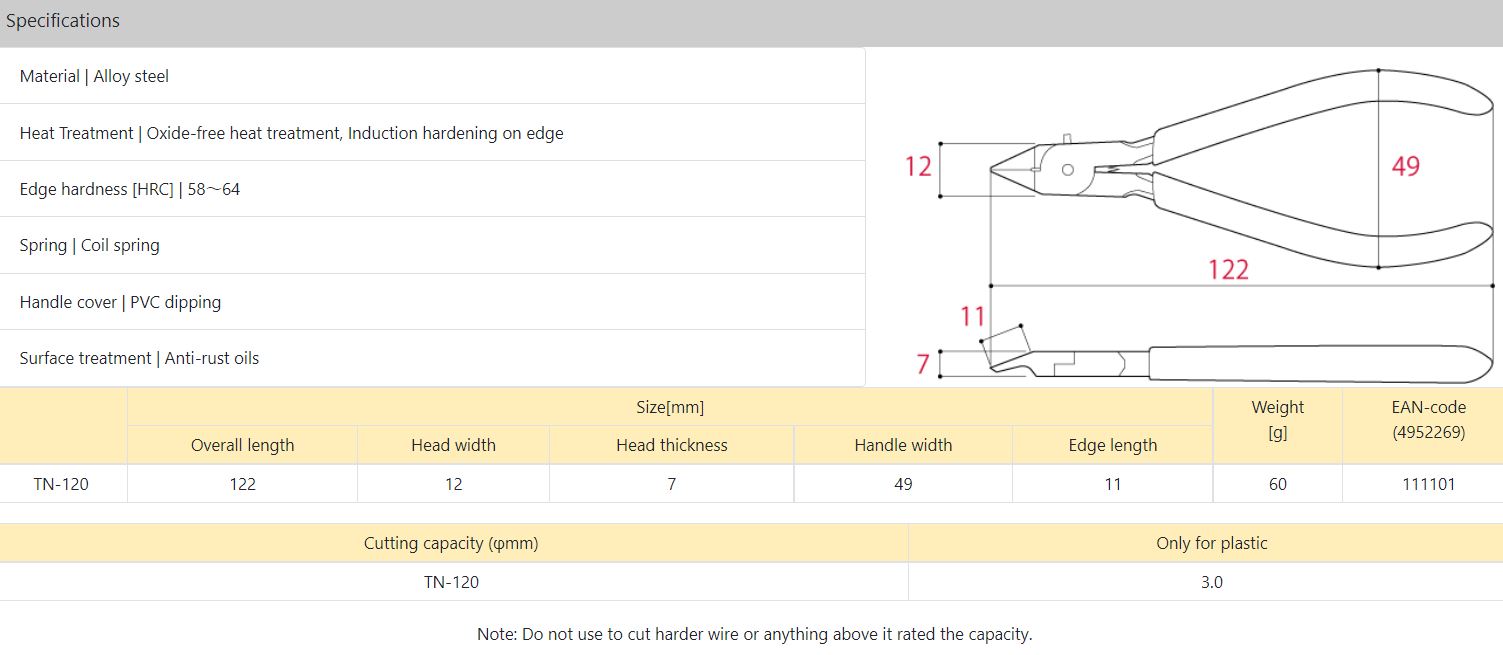 Kìm cắt TN-120 là dòng kìm chuyên để cắt nhựa chính xác cao.
