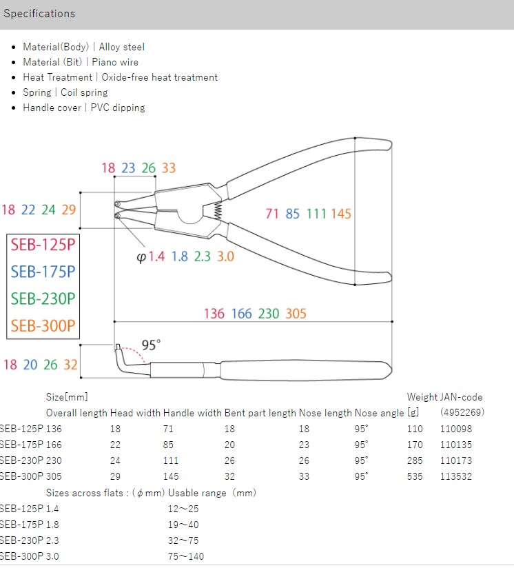 Bảng thông số Kìm mở phanh mũi thẳng SES Tsunoda