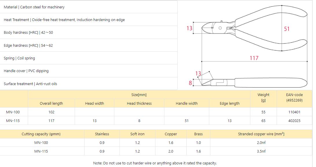 Thông số chi tiết kìm cắt MN-115