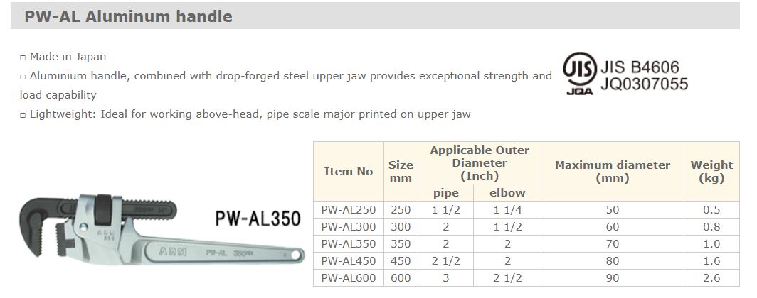 Thông số mỏ lết răng ARM dòng thân nhôm.