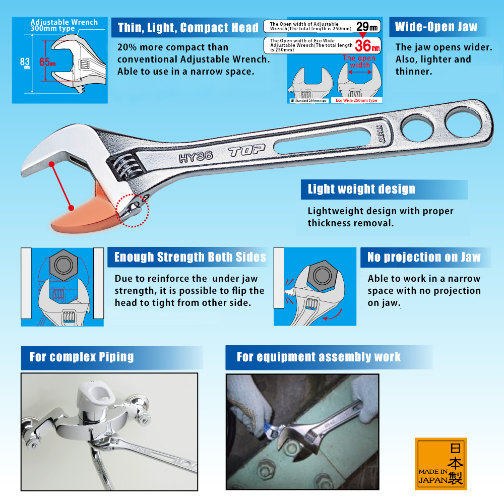 Chúng tôi là đơn vị chuyên cung cấp những loại dụng cụ cầm tay hàng đầu Nhật Bản: ASAHI, TOP, ANEX, LOBSTER, SUPER. Hiện tại mỏ lết HY-36G TOP Nhật Bản đang được công ty ASAHI phân phối trên toàn quốc.